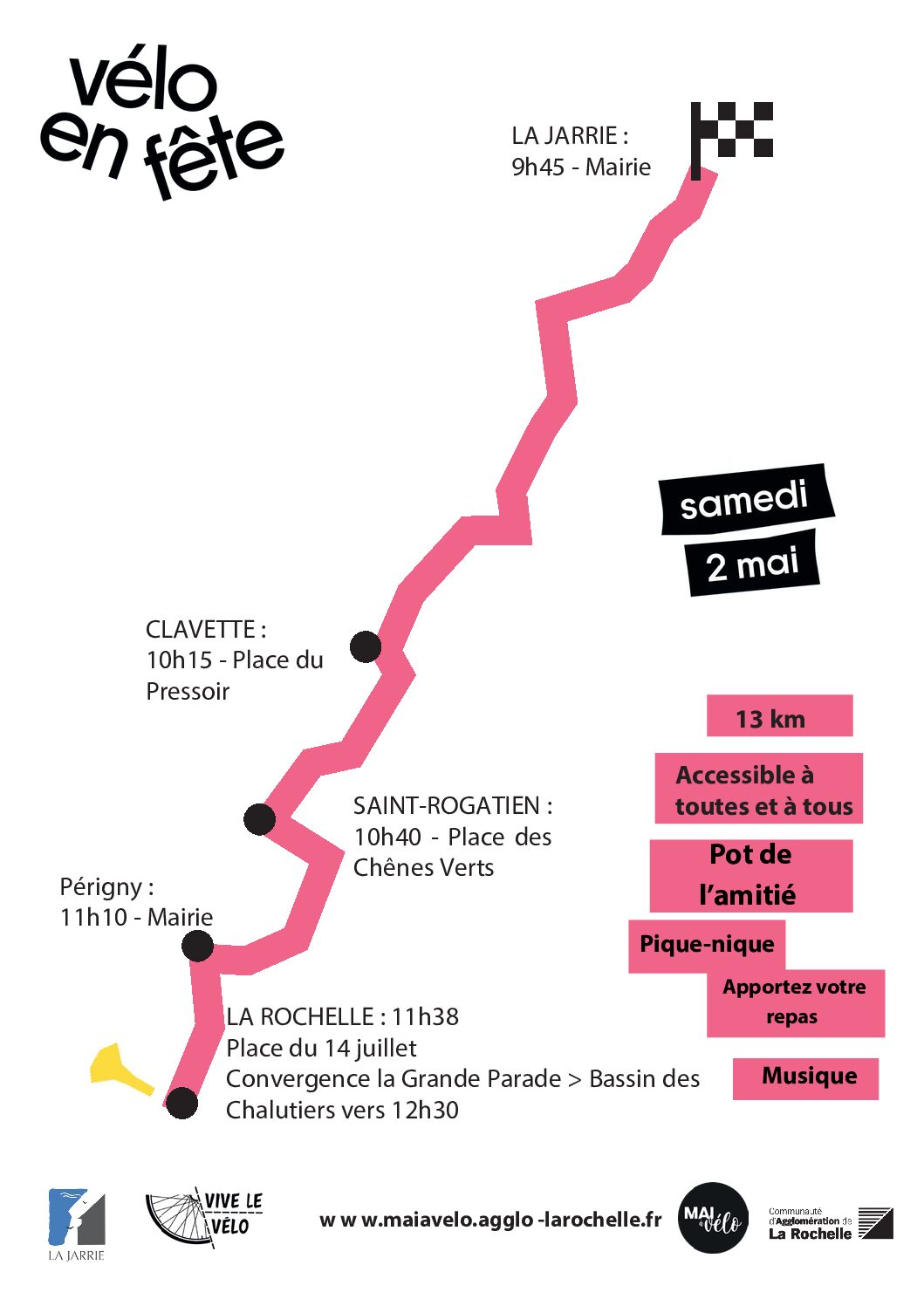 Au programme, un parcours de 13km partant à 9h45 de La Jarrie et arrivant à La Rochelle (Place du 14 Juillet) à 11h40. Une convergence pour la Grande Parade vous attend jusqu’au Bassin des Chalutiers à 12h30.